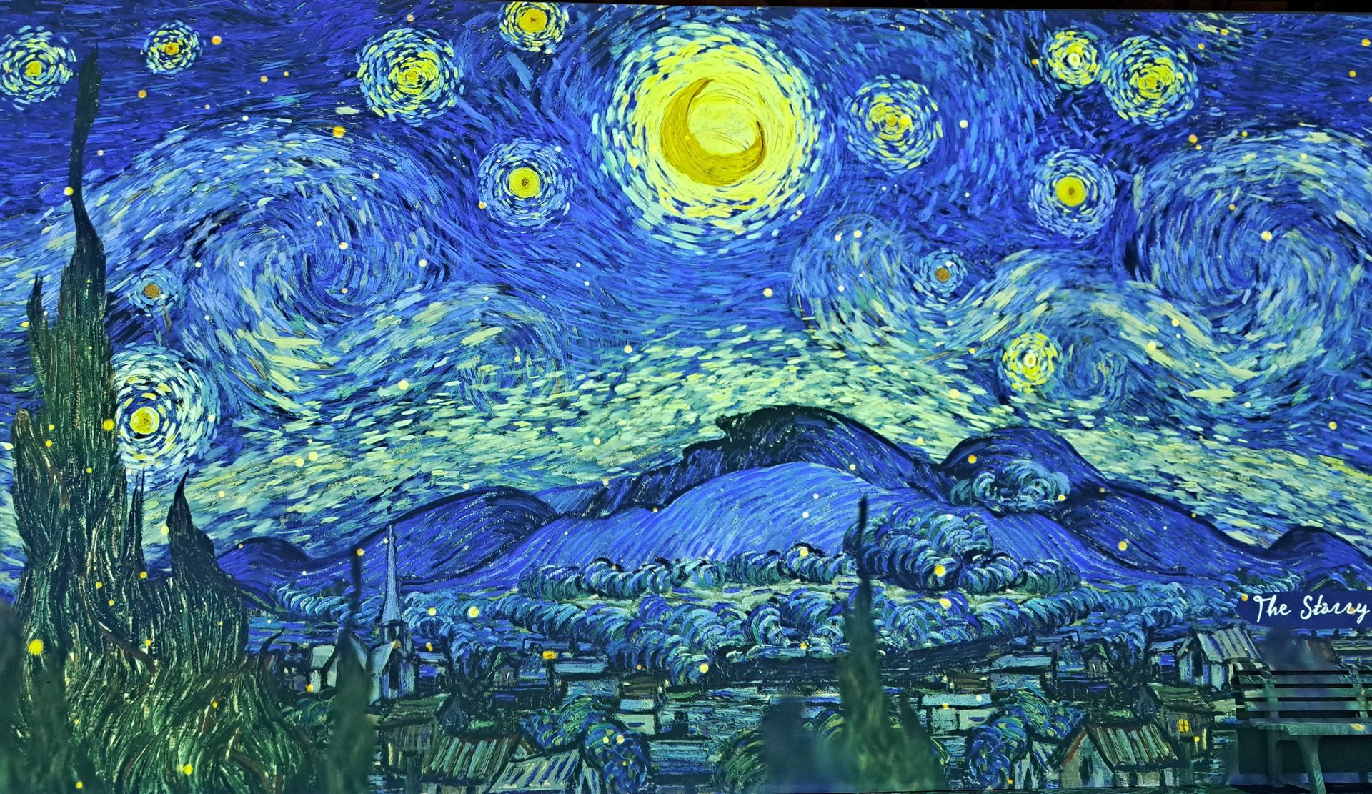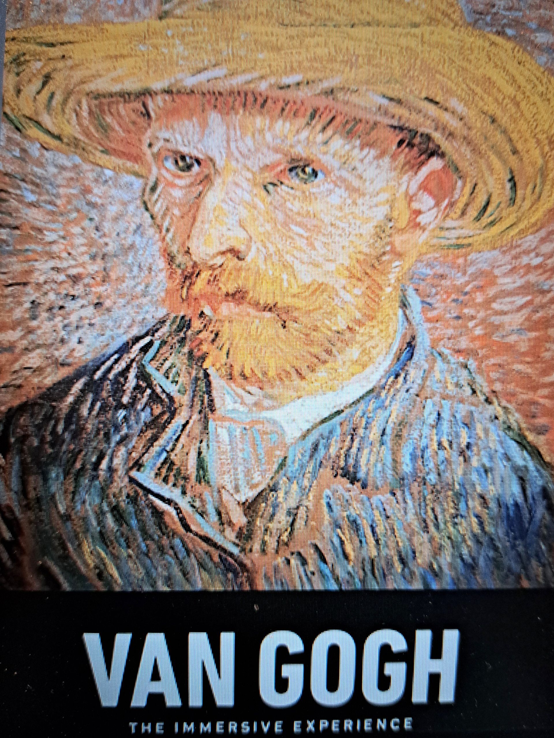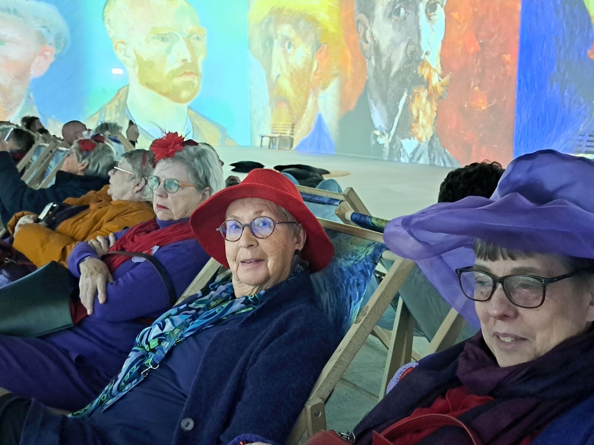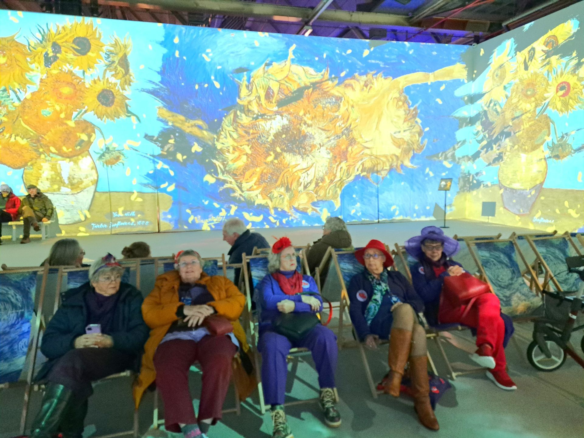 En het mooiste moest nog komen. In een grote zaal vol ligstoelen werden we omringd door een 360° videoprojectie: Van Goghs kleuren en penseelstreken bewogen over alle muren én de vloer. We hebben daar ruim een half uur met open mond liggen kijken naar alles wat voorbij kwam. Een betoverende ervaring.